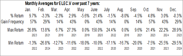 A word of caution: Only 7 years of data is available for shares of ELEC.V, perhaps insufficient to create a seasonal profile that accurately gauges the seasonal tendencies influencing the investment. Ideally, while 20 years is preferred, at least 10 years of data is required to perform a seasonal analysis that is considered to be reliable for future seasonal periods.