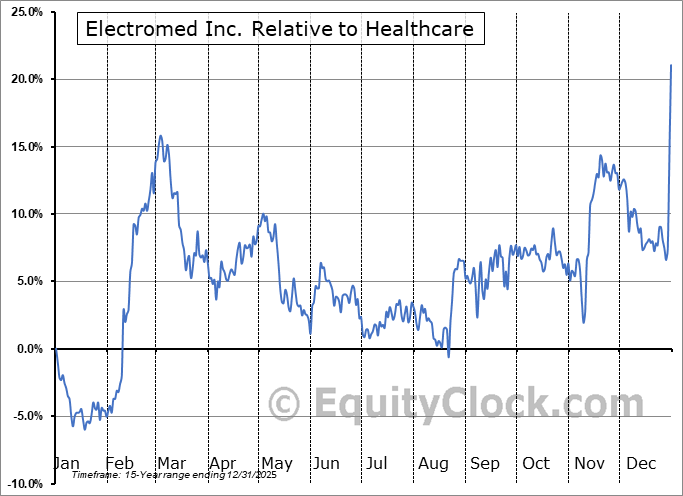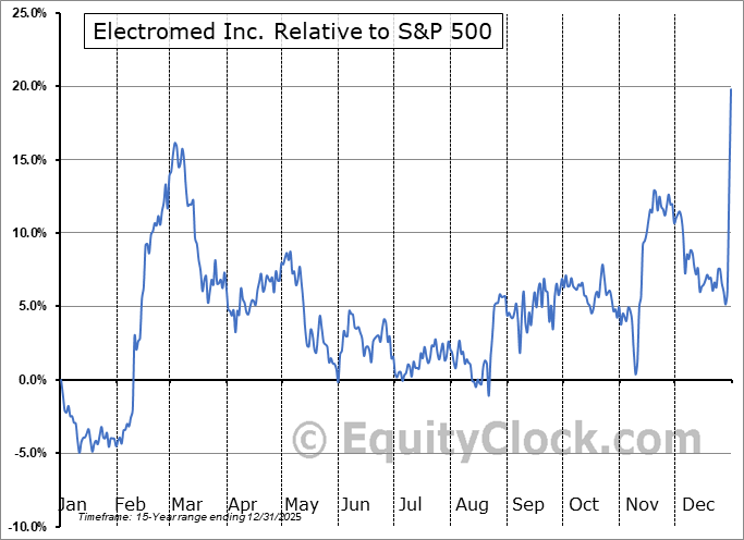 Analysis of the Electromed Inc. (AMEX:ELMD) seasonal charts above shows that a Buy Date of December 9 and a Sell Date of March 7 has resulted in a geometric average return of 14.51% above the benchmark rate of the S&P 500 Total Return Index over the past 15 years. This seasonal timeframe has shown positive results compared to the benchmark in 12 of those periods. This is a very good rate of success and the return strongly outperforms the relative buy-and-hold performance of the stock over the past 15 years by an average of 12.79% per year.