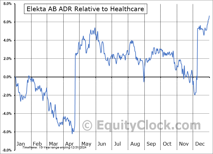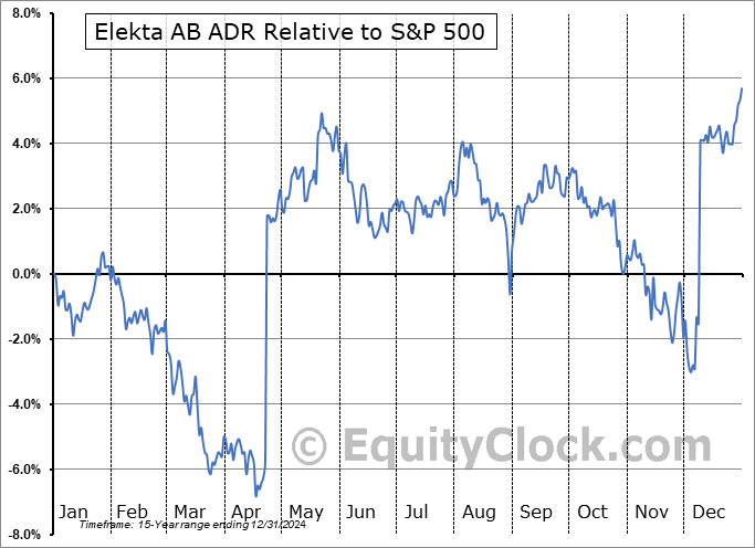 Analysis of the Elekta AB ADR (OTCMKT:EKTAY) seasonal charts above shows that a Buy Date of April 17 and a Sell Date of August 10 has resulted in a geometric average return of 7.2% above the benchmark rate of the S&P 500 Total Return Index over the past 15 years. This seasonal timeframe has shown positive results compared to the benchmark in 10 of those periods. This is a good rate of success and the return strongly outperforms the relative buy-and-hold performance of the stock over the past 15 years by an average of 14.29% per year.