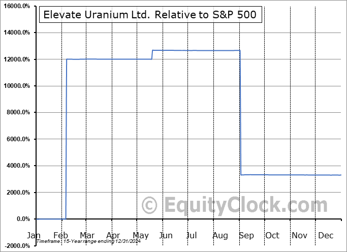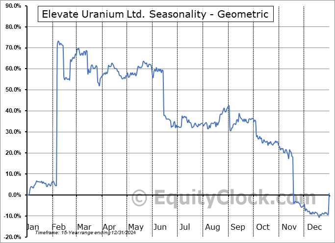 Analysis of the Elevate Uranium Ltd. (OTCMKT:ELVUF) seasonal charts above shows that a Buy Date of December 29 and a Sell Date of April 12 has resulted in a geometric average return of 75.12% above the benchmark rate of the S&P 500 Total Return Index over the past 15 years. This seasonal timeframe has shown positive results compared to the benchmark in 10 of those periods. This is a good rate of success and the return strongly outperforms the relative buy-and-hold performance of the stock over the past 15 years by an average of 86.51% per year.