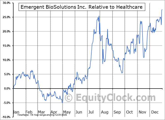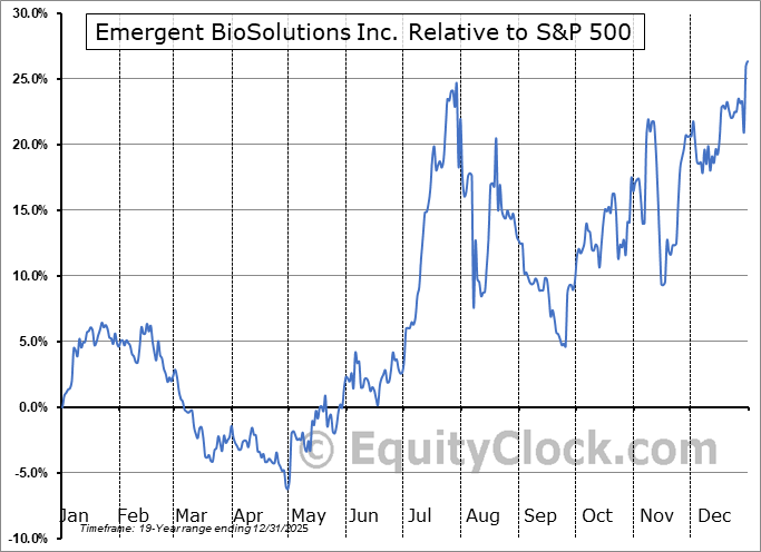 Analysis of the Emergent BioSolutions Inc. (NYSE:EBS) seasonal charts above shows that a Buy Date of November 17 and a Sell Date of February 5 has resulted in a geometric average return of 8.67% above the benchmark rate of the S&P 500 Total Return Index over the past 19 years. This seasonal timeframe has shown positive results compared to the benchmark in 15 of those periods. This is a good rate of success and the return strongly outperforms the relative buy-and-hold performance of the stock over the past 19 years by an average of 17.52% per year.