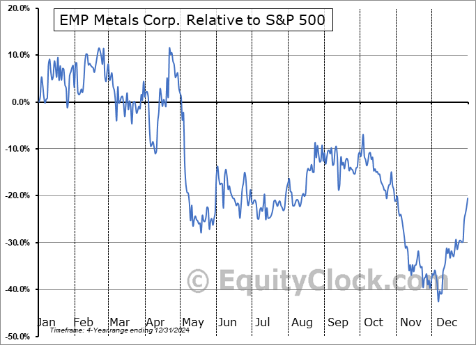 Analysis of the EMP Metals Corp. (CSE:EMPS.CA) seasonal charts above shows that a Buy Date of July 12 and a Sell Date of October 3 has resulted in a geometric average return of 35.23% above the benchmark rate of the S&P 500 Total Return Index over the past 4 years. This seasonal timeframe has shown positive results compared to the benchmark in 4 of those periods. This is an excellent rate of success and the return strongly outperforms the relative buy-and-hold performance of the stock over the past 4 years by an average of 67.12% per year.