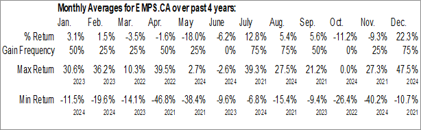 A word of caution: Only 4 years of data is available for shares of EMPS.CA, perhaps insufficient to create a seasonal profile that accurately gauges the seasonal tendencies influencing the investment. Ideally, while 20 years is preferred, at least 10 years of data is required to perform a seasonal analysis that is considered to be reliable for future seasonal periods.
