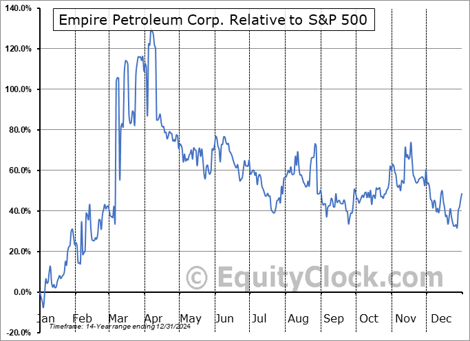 Analysis of the Empire Petroleum Corp. (AMEX:EP) seasonal charts above shows that a Buy Date of December 11 and a Sell Date of April 6 has resulted in a geometric average return of 65.85% above the benchmark rate of the S&P 500 Total Return Index over the past 14 years. This seasonal timeframe has shown positive results compared to the benchmark in 12 of those periods. This is a very good rate of success and the return strongly outperforms the relative buy-and-hold performance of the stock over the past 14 years by an average of 66.68% per year.