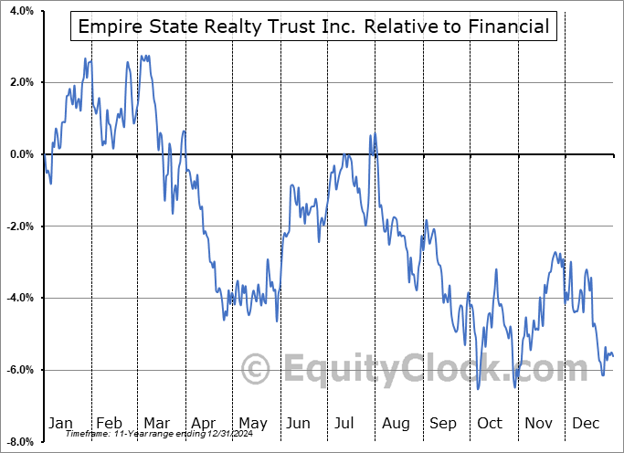 Analysis of the Empire State Realty Trust Inc. (NYSE:ESRT) seasonal charts above shows that a Buy Date of October 5 and a Sell Date of January 16 has resulted in a geometric average return of 3.11% above the benchmark rate of the S&P 500 Total Return Index over the past 11 years. This seasonal timeframe has shown positive results compared to the benchmark in 7 of those periods. This is a fair rate of success and the return strongly outperforms the relative buy-and-hold performance of the stock over the past 11 years by an average of 15.87% per year.