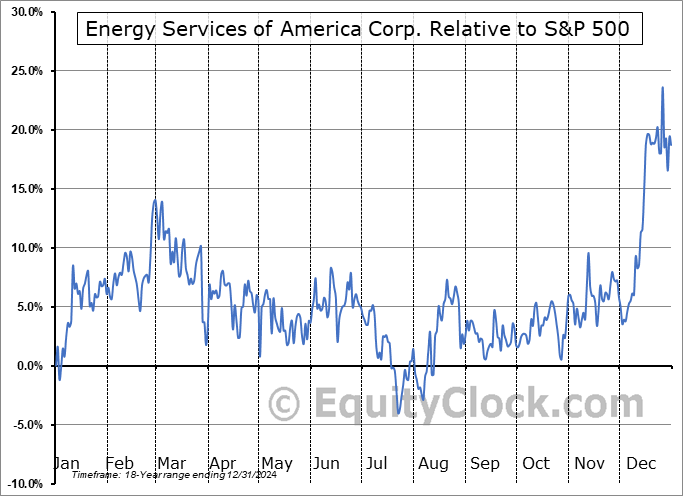 Analysis of the Energy Services of America Corp. (NASD:ESOA) seasonal charts above shows that a Buy Date of August 7 and a Sell Date of December 20 has resulted in a geometric average return of 6.17% above the benchmark rate of the S&P 500 Total Return Index over the past 18 years. This seasonal timeframe has shown positive results compared to the benchmark in 14 of those periods. This is a good rate of success and the return strongly outperforms the relative buy-and-hold performance of the stock over the past 18 years by an average of 10.37% per year.