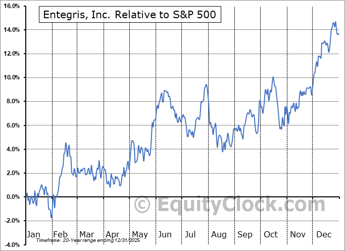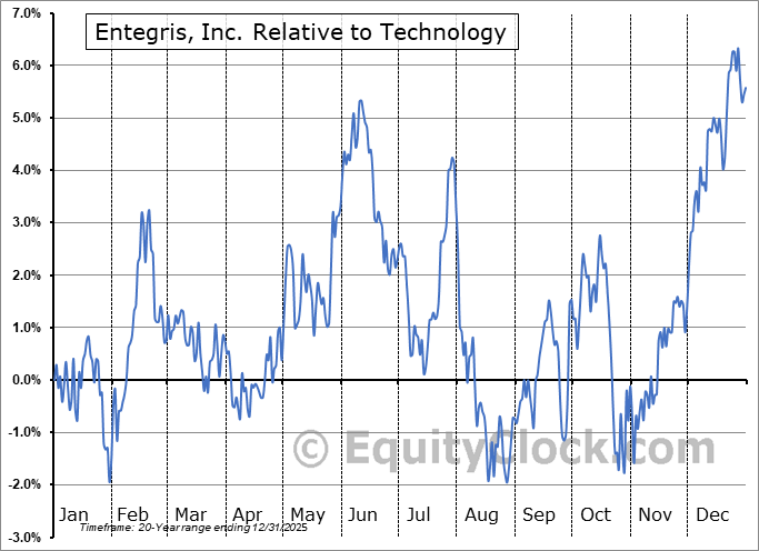 Analysis of the Entegris, Inc. (NASD:ENTG) seasonal charts above shows that a Buy Date of October 25 and a Sell Date of February 15 has resulted in a geometric average return of 6.08% above the benchmark rate of the S&P 500 Total Return Index over the past 20 years. This seasonal timeframe has shown positive results compared to the benchmark in 17 of those periods. This is a very good rate of success and the return strongly outperforms the relative buy-and-hold performance of the stock over the past 20 years by an average of 3.6% per year.