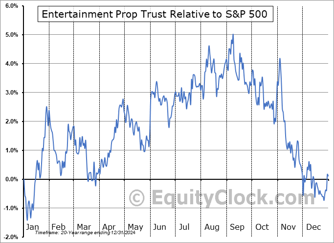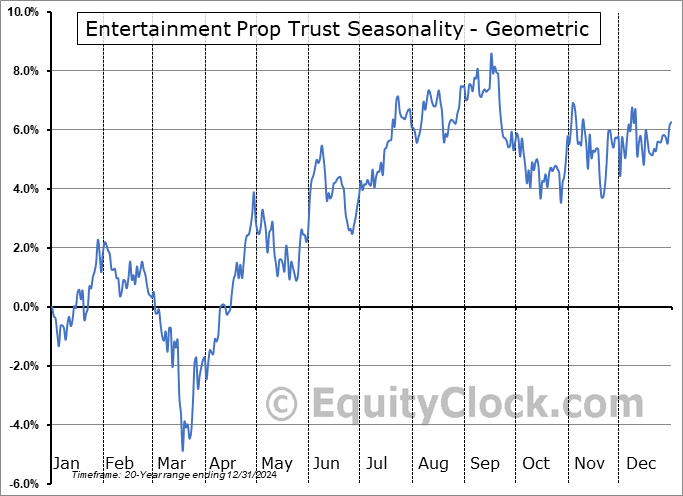 Analysis of the Entertainment Prop Trust (NYSE:EPR) seasonal charts above shows that a Buy Date of March 23 and a Sell Date of July 29 has resulted in a geometric average return of 4.68% above the benchmark rate of the S&P 500 Total Return Index over the past 20 years. This seasonal timeframe has shown positive results compared to the benchmark in 15 of those periods. This is a good rate of success and the return strongly outperforms the relative buy-and-hold performance of the stock over the past 20 years by an average of 8.1% per year.