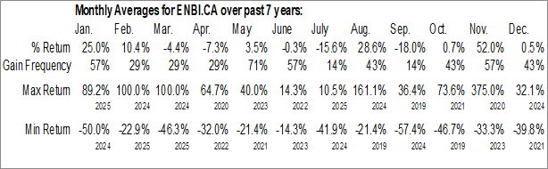 A word of caution: Only 6 years of data is available for shares of ENBI.CA, perhaps insufficient to create a seasonal profile that accurately gauges the seasonal tendencies influencing the investment. Ideally, while 20 years is preferred, at least 10 years of data is required to perform a seasonal analysis that is considered to be reliable for future seasonal periods.