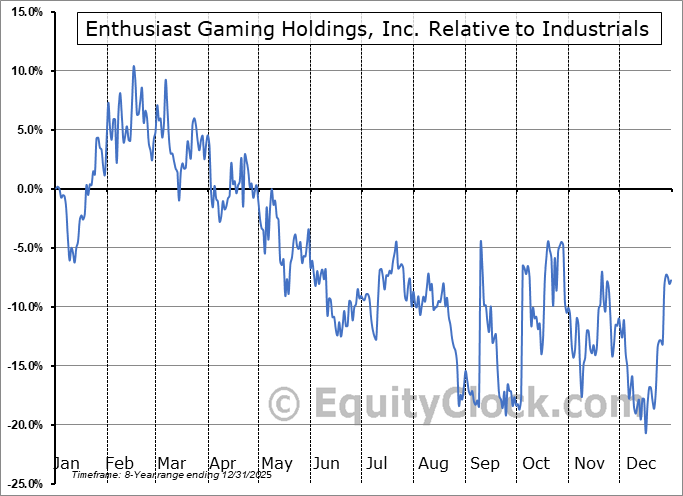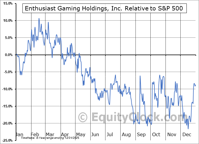 Analysis of the Enthusiast Gaming Holdings, Inc. (TSE:EGLX.TO) seasonal charts above shows that a Buy Date of January 2 and a Sell Date of March 28 has resulted in a geometric average return of 4.14% above the benchmark rate of the S&P 500 Total Return Index over the past 7 years. This seasonal timeframe has shown positive results compared to the benchmark in 6 of those periods. This is a very good rate of success and the return strongly outperforms the relative buy-and-hold performance of the stock over the past 7 years by an average of 33.12% per year.