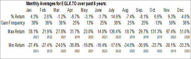 To download EGLX.TO seasonal chart data, please log in or Subscribe.
