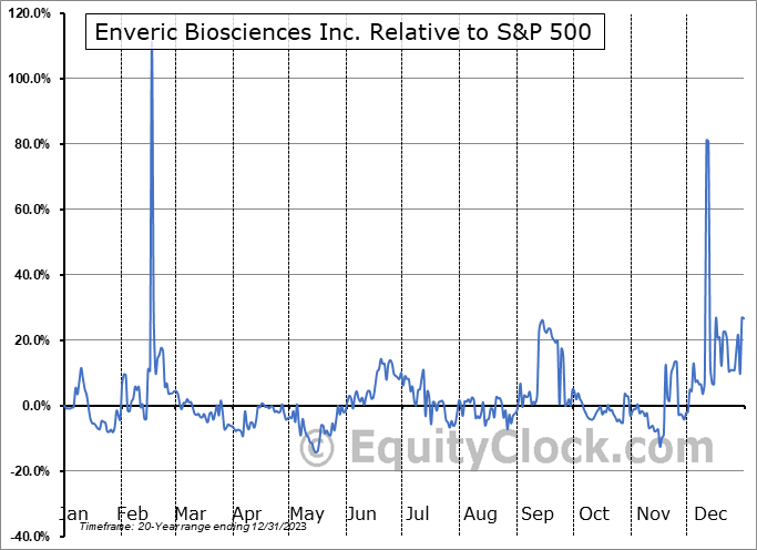 Analysis of the Enveric Biosciences Inc. (NASD:ENVB) seasonal charts above shows that a Buy Date of April 29 and a Sell Date of July 23 has resulted in a geometric average return of 7.33% above the benchmark rate of the S&P 500 Total Return Index over the past 20 years. This seasonal timeframe has shown positive results compared to the benchmark in 12 of those periods. This is a fair rate of success and the return strongly outperforms the relative buy-and-hold performance of the stock over the past 20 years by an average of 107.33% per year.