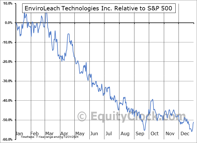 Analysis of the EnviroLeach Technologies Inc. (CSE:ETI.CA) seasonal charts above shows that a Buy Date of September 22 and a Sell Date of January 7 has resulted in a geometric average return of 10.33% above the benchmark rate of the S&P 500 Total Return Index over the past 7 years. This seasonal timeframe has shown positive results compared to the benchmark in 4 of those periods. This is a fair rate of success and the return strongly outperforms the relative buy-and-hold performance of the stock over the past 7 years by an average of 66.12% per year.