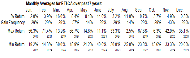 A word of caution: Only 7 years of data is available for shares of ETI.CA, perhaps insufficient to create a seasonal profile that accurately gauges the seasonal tendencies influencing the investment. Ideally, while 20 years is preferred, at least 10 years of data is required to perform a seasonal analysis that is considered to be reliable for future seasonal periods.
