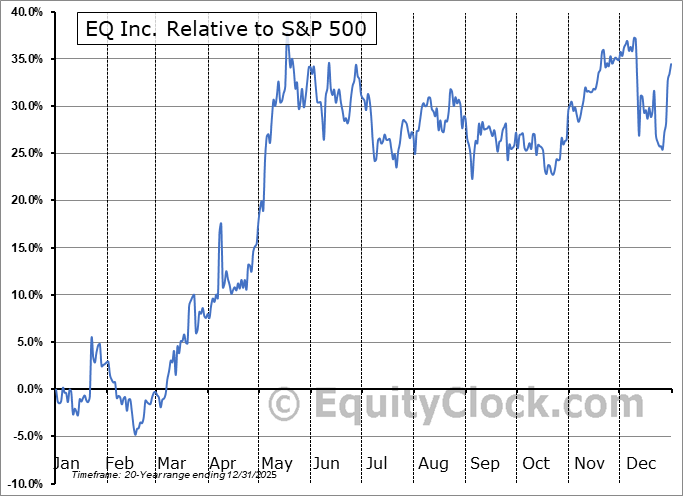Analysis of the EQ Inc. (TSXV:EQ.V) seasonal charts above shows that a Buy Date of December 17 and a Sell Date of April 6 has resulted in a geometric average return of 2.63% above the benchmark rate of the S&P 500 Total Return Index over the past 20 years. This seasonal timeframe has shown positive results compared to the benchmark in 14 of those periods. This is a good rate of success and the return strongly outperforms the relative buy-and-hold performance of the stock over the past 20 years by an average of 17.85% per year.