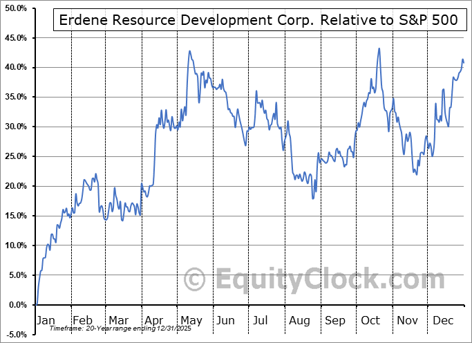 Analysis of the Erdene Resource Development Corp. (OTCMKT:ERDCF) seasonal charts above shows that a Buy Date of December 25 and a Sell Date of April 15 has resulted in a geometric average return of 24.23% above the benchmark rate of the S&P 500 Total Return Index over the past 19 years. This seasonal timeframe has shown positive results compared to the benchmark in 16 of those periods. This is a very good rate of success and the return strongly outperforms the relative buy-and-hold performance of the stock over the past 19 years by an average of 37.91% per year.