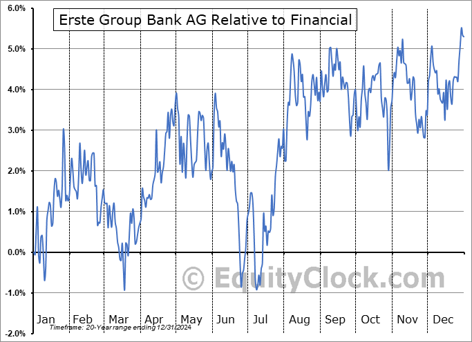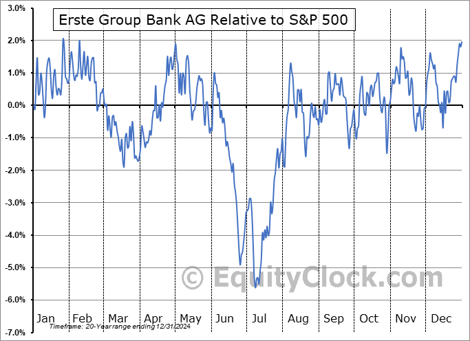 Analysis of the Erste Group Bank AG (OTCMKT:EBKDY) seasonal charts above shows that a Buy Date of December 13 and a Sell Date of April 24 has resulted in a geometric average return of 1.81% above the benchmark rate of the S&P 500 Total Return Index over the past 20 years. This seasonal timeframe has shown positive results compared to the benchmark in 15 of those periods. This is a good rate of success and the return strongly outperforms the relative buy-and-hold performance of the stock over the past 20 years by an average of 9.4% per year.