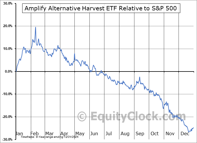 Analysis of the Amplify Alternative Harvest ETF (NYSE:MJ) seasonal charts above shows that a Buy Date of December 21 and a Sell Date of March 25 has resulted in a geometric average return of 8.16% above the benchmark rate of the S&P 500 Total Return Index over the past 9 years. This seasonal timeframe has shown positive results compared to the benchmark in 7 of those periods. This is a good rate of success and the return strongly outperforms the relative buy-and-hold performance of the stock over the past 9 years by an average of 37.61% per year.