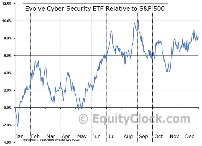 Analysis of the Evolve Cyber Security ETF (TSE:CYBR.TO) seasonal charts above shows that a Buy Date of December 6 and a Sell Date of March 1 has resulted in a geometric average return of 4.42% above the benchmark rate of the S&P 500 Total Return Index over the past 7 years. This seasonal timeframe has shown positive results compared to the benchmark in 7 of those periods. This is an excellent rate of success and the return strongly outperforms the relative buy-and-hold performance of the stock over the past 7 years by an average of 4.33% per year.
