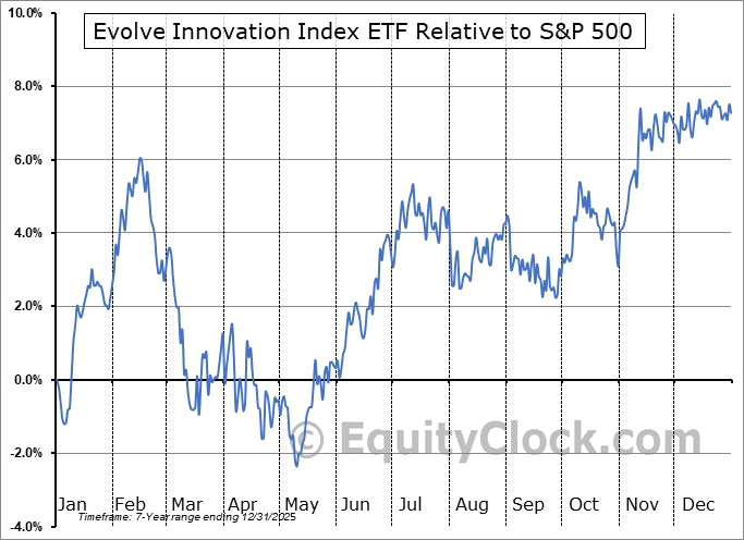 Analysis of the Evolve Innovation Index ETF (TSE:EDGE.TO) seasonal charts above shows that a Buy Date of October 30 and a Sell Date of February 15 has resulted in a geometric average return of 3.63% above the benchmark rate of the S&P 500 Total Return Index over the past 6 years. This seasonal timeframe has shown positive results compared to the benchmark in 5 of those periods. This is a very good rate of success and the return strongly outperforms the relative buy-and-hold performance of the stock over the past 6 years by an average of 5.6% per year.