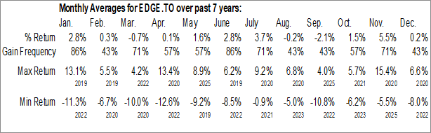 A word of caution: Only 6 years of data is available for shares of EDGE.TO, perhaps insufficient to create a seasonal profile that accurately gauges the seasonal tendencies influencing the investment. Ideally, while 20 years is preferred, at least 10 years of data is required to perform a seasonal analysis that is considered to be reliable for future seasonal periods.