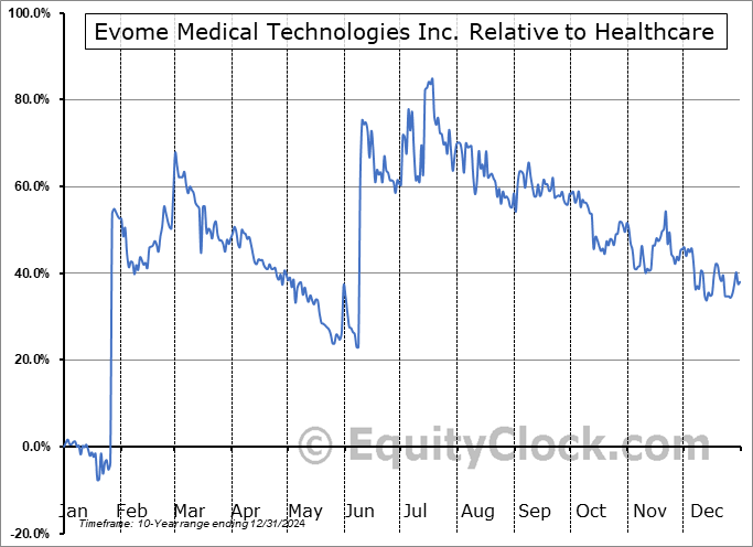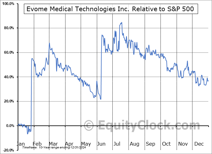 Analysis of the Evome Medical Technologies Inc. (TSXV:EVMT.V) seasonal charts above shows that a Buy Date of September 13 and a Sell Date of January 28 has resulted in a geometric average return of 9.43% above the benchmark rate of the S&P 500 Total Return Index over the past 10 years. This seasonal timeframe has shown positive results compared to the benchmark in 7 of those periods. This is a good rate of success and the return strongly outperforms the relative buy-and-hold performance of the stock over the past 10 years by an average of 16.15% per year.
