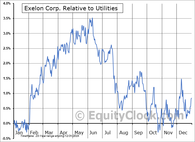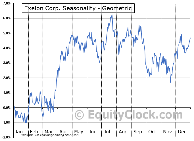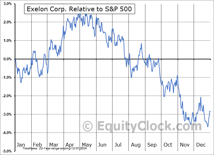 Analysis of the Exelon Corp. (NASD:EXC) seasonal charts above shows that a Buy Date of February 15 and a Sell Date of June 5 has resulted in a geometric average return of 1.77% above the benchmark rate of the S&P 500 Total Return Index over the past 20 years. This seasonal timeframe has shown positive results compared to the benchmark in 15 of those periods. This is a good rate of success and the return strongly outperforms the relative buy-and-hold performance of the stock over the past 20 years by an average of 6.75% per year.