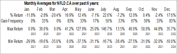 A word of caution: Only 6 years of data is available for shares of NFLD.CA, perhaps insufficient to create a seasonal profile that accurately gauges the seasonal tendencies influencing the investment. Ideally, while 20 years is preferred, at least 10 years of data is required to perform a seasonal analysis that is considered to be reliable for future seasonal periods.