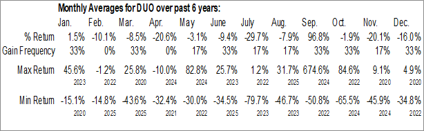 A word of caution: Only 5 years of data is available for shares of DUO, perhaps insufficient to create a seasonal profile that accurately gauges the seasonal tendencies influencing the investment. Ideally, while 20 years is preferred, at least 10 years of data is required to perform a seasonal analysis that is considered to be reliable for future seasonal periods.
