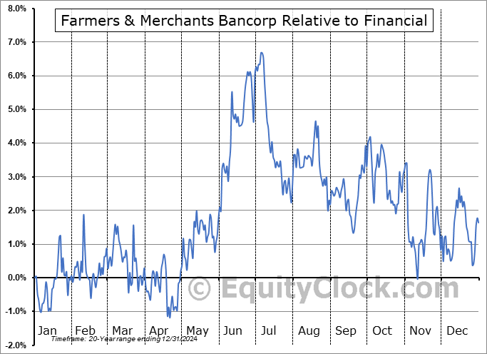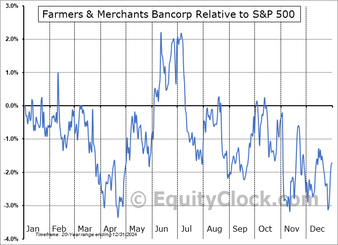 Analysis of the Farmers & Merchants Bancorp (OTCMKT:FMCB) seasonal charts above shows that a Buy Date of April 5 and a Sell Date of July 8 has resulted in a geometric average return of 3.76% above the benchmark rate of the S&P 500 Total Return Index over the past 20 years. This seasonal timeframe has shown positive results compared to the benchmark in 15 of those periods. This is a good rate of success and the return strongly outperforms the relative buy-and-hold performance of the stock over the past 20 years by an average of 6.52% per year.