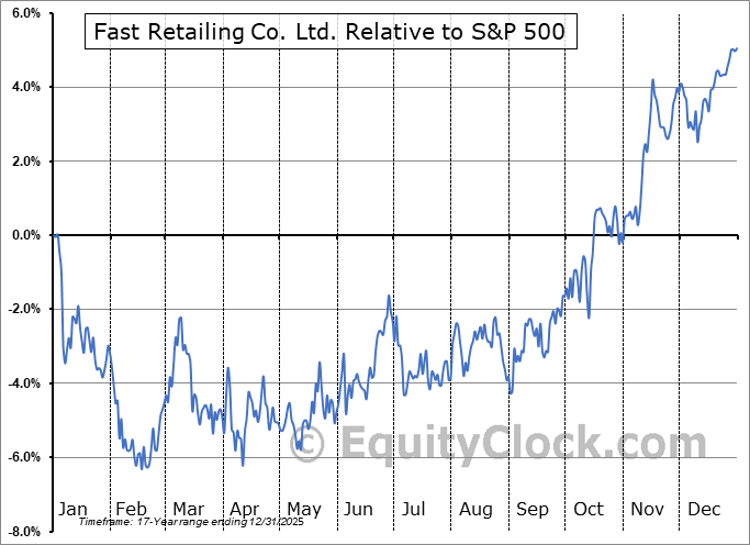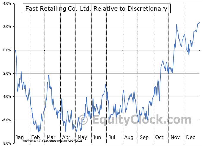 Analysis of the Fast Retailing Co. Ltd. (OTCMKT:FRCOY) seasonal charts above shows that a Buy Date of July 26 and a Sell Date of December 20 has resulted in a geometric average return of 6.02% above the benchmark rate of the S&P 500 Total Return Index over the past 16 years. This seasonal timeframe has shown positive results compared to the benchmark in 12 of those periods. This is a good rate of success and the return strongly outperforms the relative buy-and-hold performance of the stock over the past 16 years by an average of 7.31% per year.