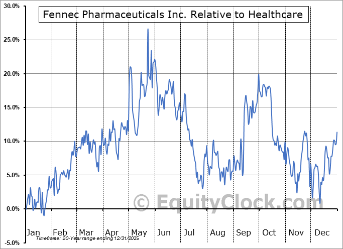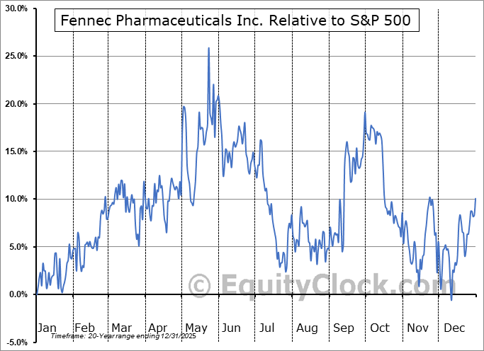 Analysis of the Fennec Pharmaceuticals Inc. (NASD:FENC) seasonal charts above shows that a Buy Date of December 13 and a Sell Date of March 19 has resulted in a geometric average return of 11.93% above the benchmark rate of the S&P 500 Total Return Index over the past 20 years. This seasonal timeframe has shown positive results compared to the benchmark in 15 of those periods. This is a good rate of success and the return strongly outperforms the relative buy-and-hold performance of the stock over the past 20 years by an average of 33.63% per year.