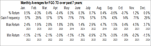 A word of caution: Only 6 years of data is available for shares of FGO.TO, perhaps insufficient to create a seasonal profile that accurately gauges the seasonal tendencies influencing the investment. Ideally, while 20 years is preferred, at least 10 years of data is required to perform a seasonal analysis that is considered to be reliable for future seasonal periods.