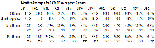 To download FXM.TO seasonal chart data, please log in or Subscribe.