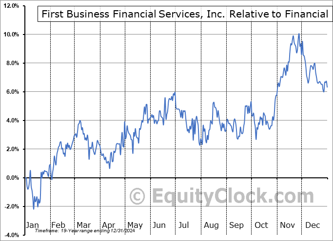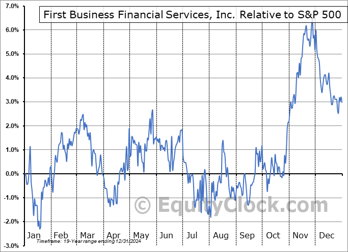 Analysis of the First Business Financial Services, Inc. (NASD:FBIZ) seasonal charts above shows that a Buy Date of August 25 and a Sell Date of November 26 has resulted in a geometric average return of 7.26% above the benchmark rate of the S&P 500 Total Return Index over the past 19 years. This seasonal timeframe has shown positive results compared to the benchmark in 16 of those periods. This is a very good rate of success and the return strongly outperforms the relative buy-and-hold performance of the stock over the past 19 years by an average of 8.47% per year.