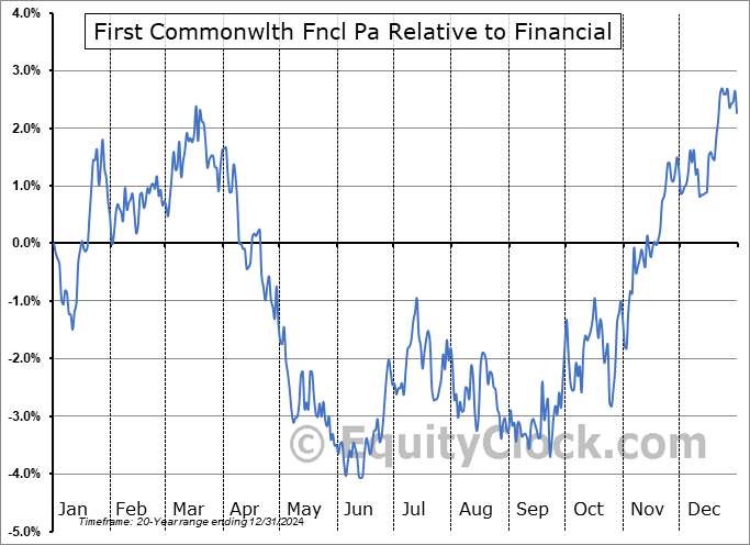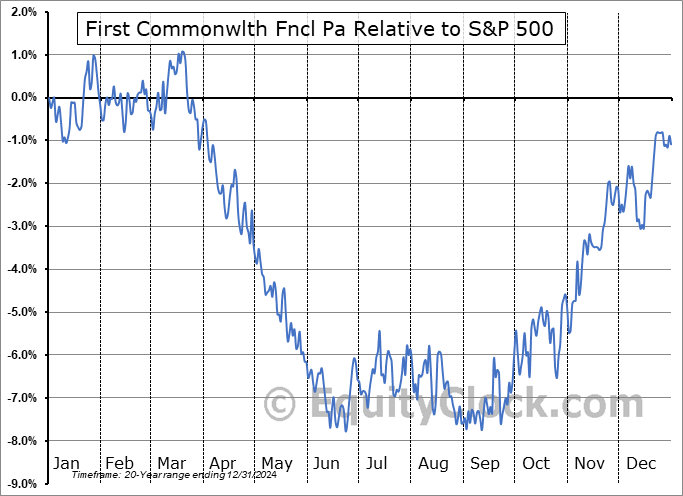 Analysis of the First Commonwlth Fncl Pa (NYSE:FCF) seasonal charts above shows that a Buy Date of August 27 and a Sell Date of December 2 has resulted in a geometric average return of 4.19% above the benchmark rate of the S&P 500 Total Return Index over the past 20 years. This seasonal timeframe has shown positive results compared to the benchmark in 16 of those periods. This is a very good rate of success and the return strongly outperforms the relative buy-and-hold performance of the stock over the past 20 years by an average of 9.79% per year.