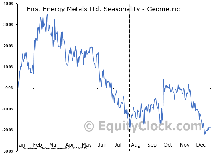 Analysis of the First Energy Metals Ltd. (CSE:FE.CA) seasonal charts above shows that a Buy Date of December 22 and a Sell Date of March 25 has resulted in a geometric average return of 21.77% above the benchmark rate of the S&P 500 Total Return Index over the past 15 years. This seasonal timeframe has shown positive results compared to the benchmark in 10 of those periods. This is a good rate of success and the return strongly outperforms the relative buy-and-hold performance of the stock over the past 15 years by an average of 51.34% per year.