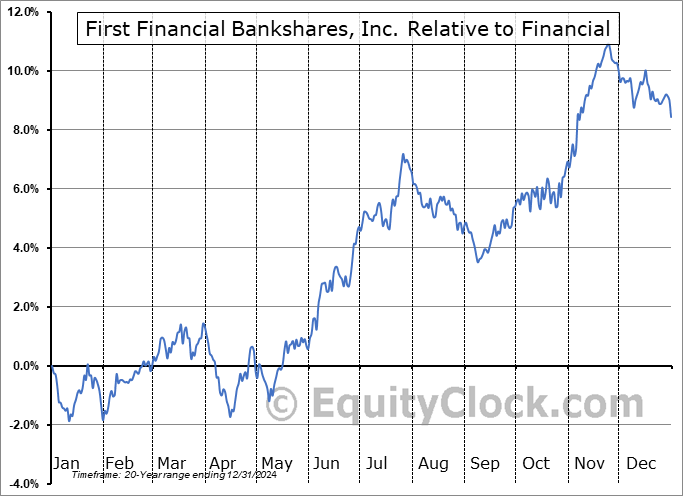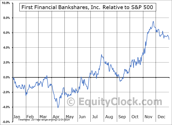 Analysis of the First Financial Bankshares, Inc. (NASD:FFIN) seasonal charts above shows that a Buy Date of September 9 and a Sell Date of December 17 has resulted in a geometric average return of 5.68% above the benchmark rate of the S&P 500 Total Return Index over the past 20 years. This seasonal timeframe has shown positive results compared to the benchmark in 17 of those periods. This is a very good rate of success and the return strongly outperforms the relative buy-and-hold performance of the stock over the past 20 years by an average of 3.93% per year.