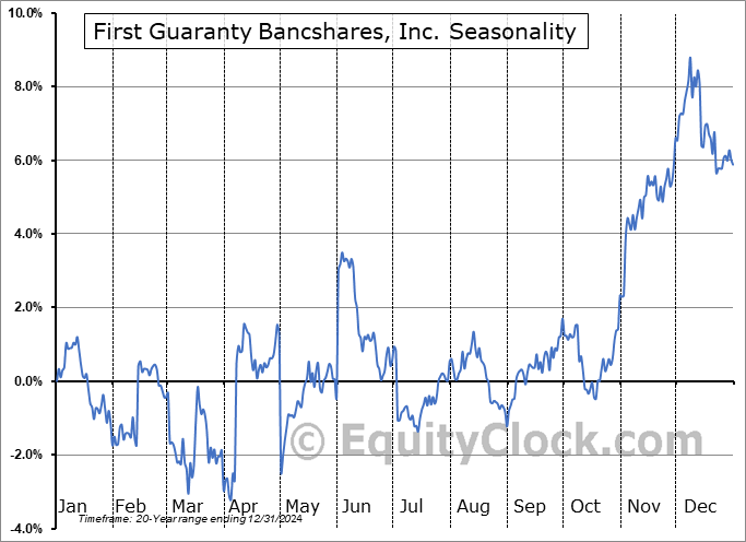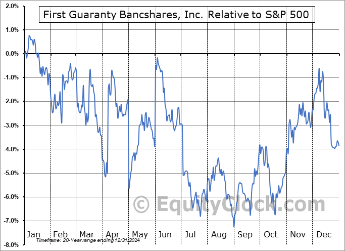 Analysis of the First Guaranty Bancshares, Inc. (NASD:FGBI) seasonal charts above shows that a Buy Date of July 23 and a Sell Date of November 5 has resulted in a geometric average return of 3.64% above the benchmark rate of the S&P 500 Total Return Index over the past 20 years. This seasonal timeframe has shown positive results compared to the benchmark in 14 of those periods. This is a good rate of success and the return strongly outperforms the relative buy-and-hold performance of the stock over the past 20 years by an average of 10.62% per year.