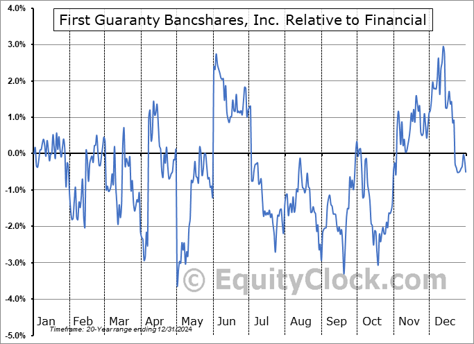 The seasonal timeframe correlates Poorly with the period of seasonal strength for the Financial sector, which runs from November 22 to April 13. The seasonal chart for the broad sector is available via the following link: Financial Sector Seasonal Chart.