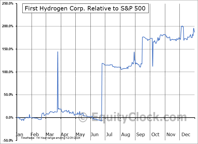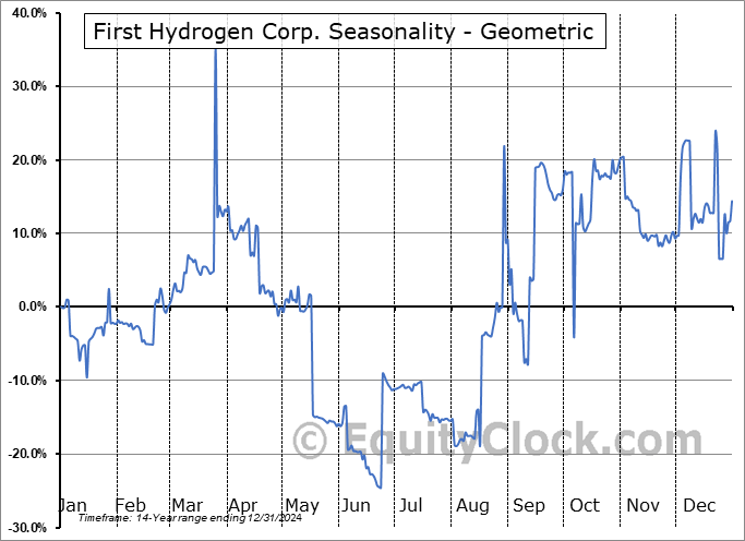 Analysis of the First Hydrogen Corp. (TSXV:FHYD.V) seasonal charts above shows that a Buy Date of December 29 and a Sell Date of April 12 has resulted in a geometric average return of 10.31% above the benchmark rate of the S&P 500 Total Return Index over the past 14 years. This seasonal timeframe has shown positive results compared to the benchmark in 9 of those periods. This is a fair rate of success and the return strongly outperforms the relative buy-and-hold performance of the stock over the past 14 years by an average of 9.61% per year.