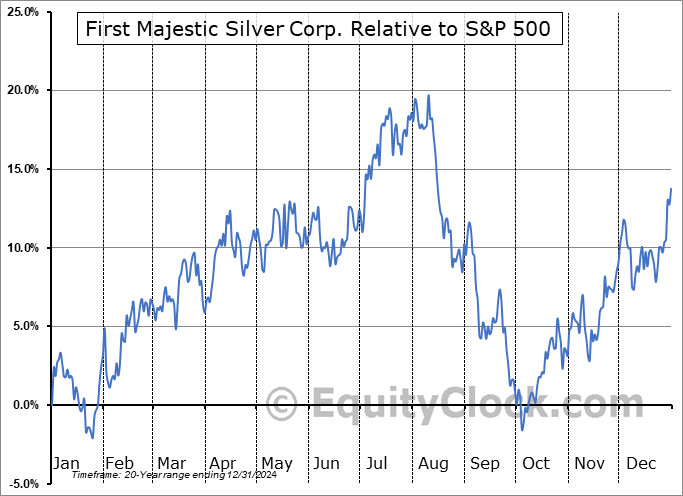 Analysis of the First Majestic Silver Corp. (TSE:AG.TO) seasonal charts above shows that a Buy Date of December 8 and a Sell Date of May 3 has resulted in a geometric average return of 8.54% above the benchmark rate of the S&P 500 Total Return Index over the past 20 years. This seasonal timeframe has shown positive results compared to the benchmark in 15 of those periods. This is a good rate of success and the return strongly outperforms the relative buy-and-hold performance of the stock over the past 20 years by an average of 10.94% per year.