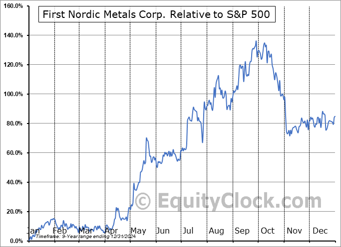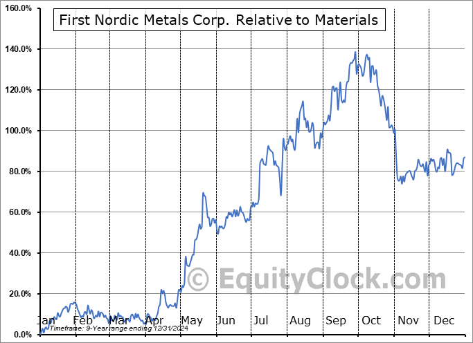 Analysis of the First Nordic Metals Corp. (TSXV:FNM.V) seasonal charts above shows that a Buy Date of June 29 and a Sell Date of September 24 has resulted in a geometric average return of 17.4% above the benchmark rate of the S&P 500 Total Return Index over the past 9 years. This seasonal timeframe has shown positive results compared to the benchmark in 7 of those periods. This is a good rate of success and the return strongly outperforms the relative buy-and-hold performance of the stock over the past 9 years by an average of 17.72% per year.