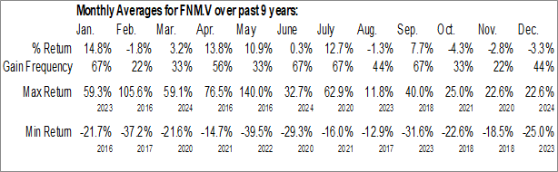 A word of caution: Only 9 years of data is available for shares of FNM.V, perhaps insufficient to create a seasonal profile that accurately gauges the seasonal tendencies influencing the investment. Ideally, while 20 years is preferred, at least 10 years of data is required to perform a seasonal analysis that is considered to be reliable for future seasonal periods.