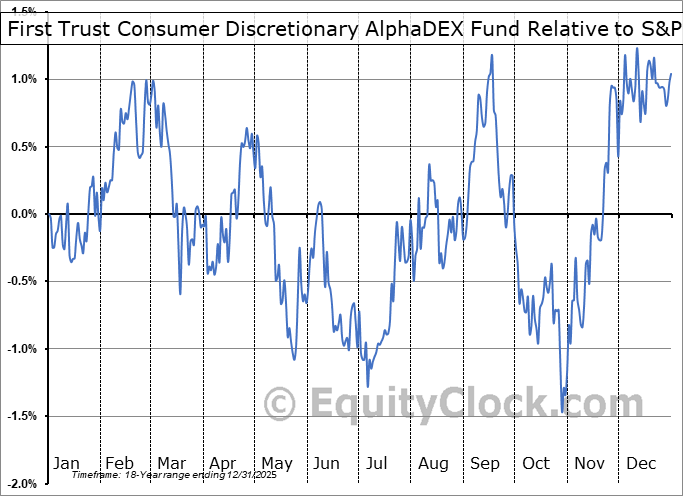 Analysis of the First Trust Consumer Discretionary AlphaDEX Fund (NYSE:FXD) seasonal charts above shows that a Buy Date of November 18 and a Sell Date of March 7 has resulted in a geometric average return of 0.68% above the benchmark rate of the S&P 500 Total Return Index over the past 18 years. This seasonal timeframe has shown positive results compared to the benchmark in 14 of those periods. This is a good rate of success and the return strongly outperforms the relative buy-and-hold performance of the stock over the past 18 years by an average of 2.4% per year.