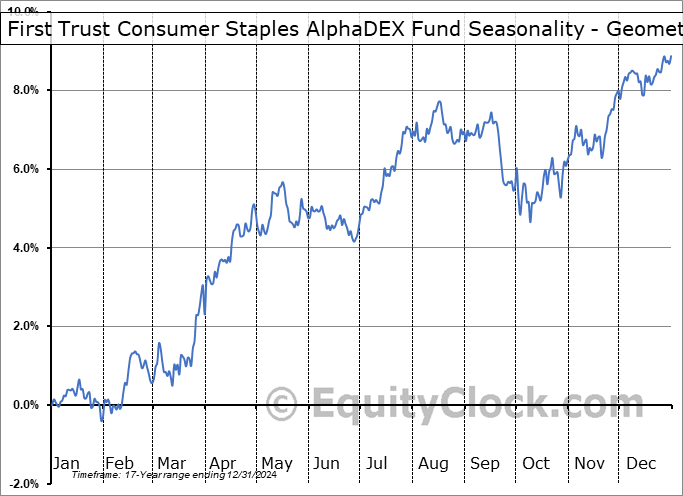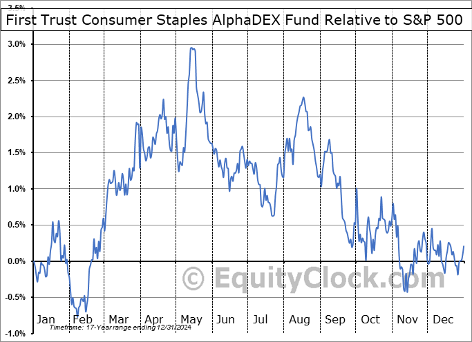 Analysis of the First Trust Consumer Staples AlphaDEX Fund (NYSE:FXG) seasonal charts above shows that a Buy Date of February 9 and a Sell Date of May 15 has resulted in a geometric average return of 2.63% above the benchmark rate of the S&P 500 Total Return Index over the past 17 years. This seasonal timeframe has shown positive results compared to the benchmark in 13 of those periods. This is a good rate of success and the return strongly outperforms the relative buy-and-hold performance of the stock over the past 17 years by an average of 4.14% per year.
