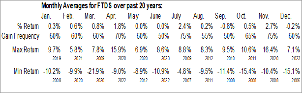 Analysis of the First Trust Dividend Strength ETF (NASD:FTDS) seasonal charts above shows that a Buy Date of December 7 and a Sell Date of March 7 has resulted in a geometric average return of 0.49% above the benchmark rate of the S&P 500 Total Return Index over the past 20 years. This seasonal timeframe has shown positive results compared to the benchmark in 14 of those periods. This is a good rate of success and the return strongly outperforms the relative buy-and-hold performance of the stock over the past 20 years by an average of 2.91% per year.
