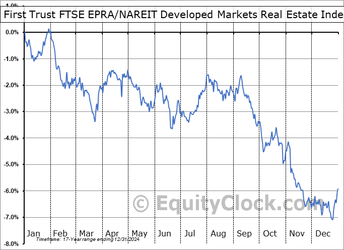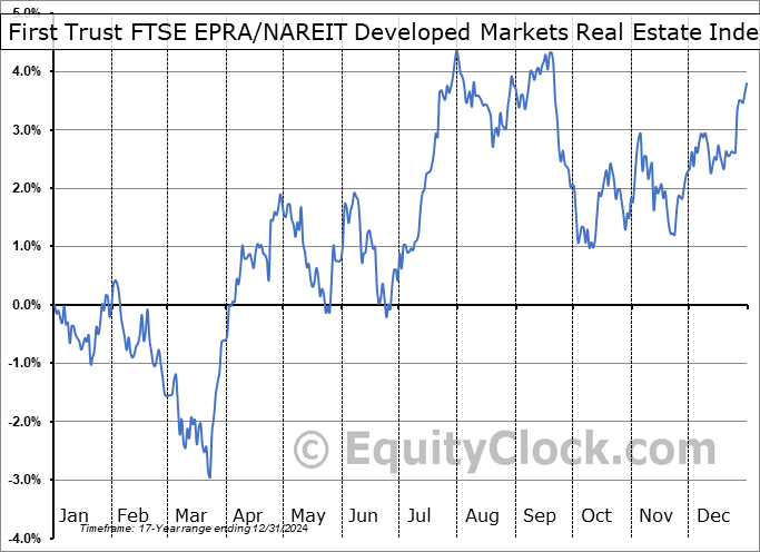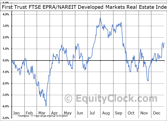 Analysis of the First Trust FTSE EPRA/NAREIT Developed Markets Real Estate Index Fund (NYSE:DTRE) seasonal charts above shows that a Buy Date of March 19 and a Sell Date of August 1 has resulted in a geometric average return of 0.4% above the benchmark rate of the S&P 500 Total Return Index over the past 17 years. This seasonal timeframe has shown positive results compared to the benchmark in 10 of those periods. This is a fair rate of success and the return strongly outperforms the relative buy-and-hold performance of the stock over the past 17 years by an average of 8.52% per year.