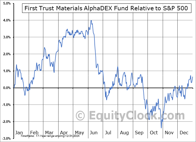 Analysis of the First Trust Materials AlphaDEX Fund (NYSE:FXZ) seasonal charts above shows that a Buy Date of November 9 and a Sell Date of April 3 has resulted in a geometric average return of 3.08% above the benchmark rate of the S&P 500 Total Return Index over the past 17 years. This seasonal timeframe has shown positive results compared to the benchmark in 14 of those periods. This is a very good rate of success and the return strongly outperforms the relative buy-and-hold performance of the stock over the past 17 years by an average of 6.09% per year.