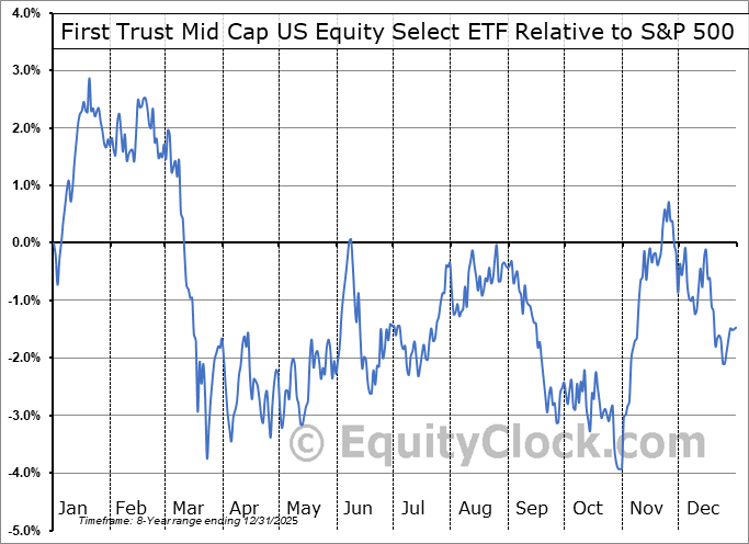 Analysis of the First Trust Mid Cap US Equity Select ETF (NASD:FSCS) seasonal charts above shows that a Buy Date of October 27 and a Sell Date of January 18 has resulted in a geometric average return of 1.79% above the benchmark rate of the S&P 500 Total Return Index over the past 8 years. This seasonal timeframe has shown positive results compared to the benchmark in 6 of those periods. This is a good rate of success and the return strongly outperforms the relative buy-and-hold performance of the stock over the past 8 years by an average of 7.16% per year.